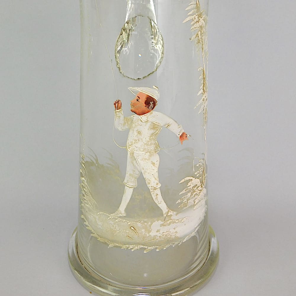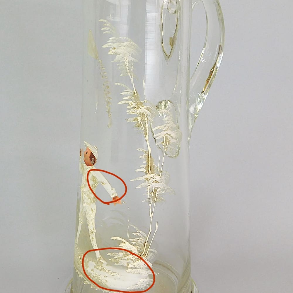 French art deco lemonade jug depicting a kite flying boy next to a windswept tree in thick enamel paint.