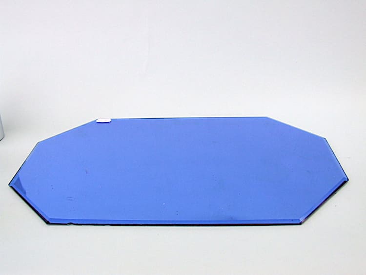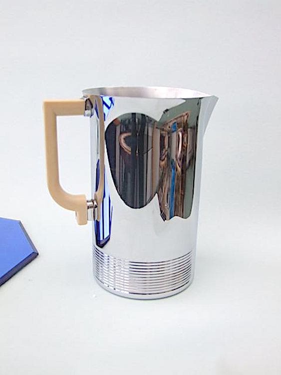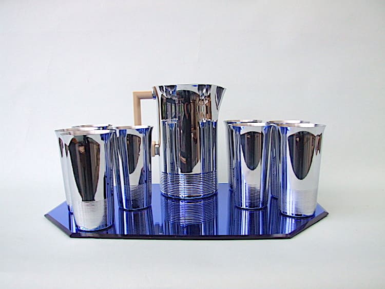 American chrome and white bakelite lemonade set with bevelled edge electric blue mirror glass panel marked Chase to the bases and designed in the 1930’s by Von Nesson. Consists of large jug and 8 matching chrome beakers.