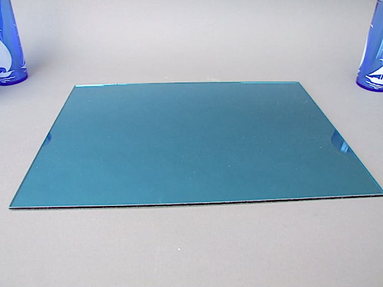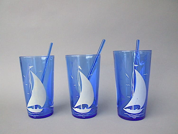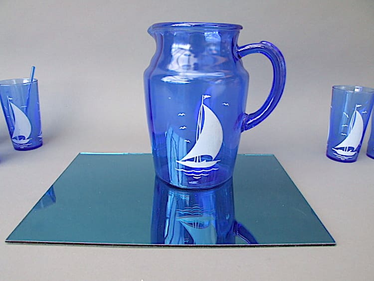 Set consists of Jug, 5 slightly larger glasses, 5 smaller tumblers, 6 swizzle sticks and a blue mirror glass tray panel.