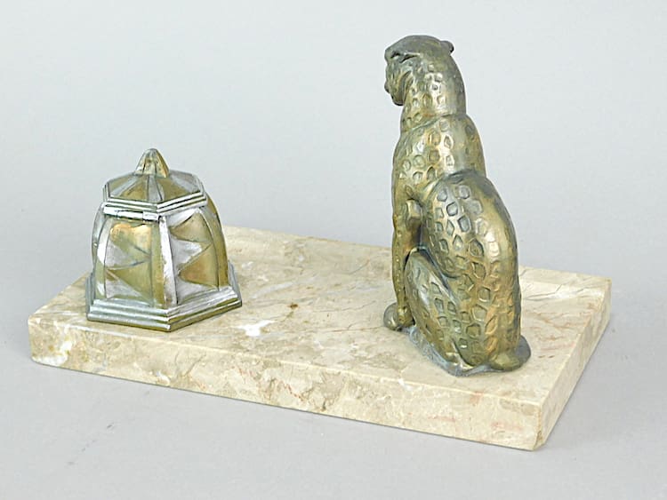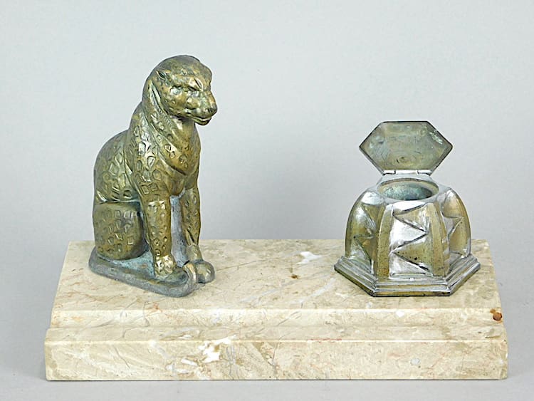This lovely Egyptian themed desk set is French and made of spelter with a marble base. The patina is gold and silver and it is signed Jalnar on the leopards tail. The ink pot no longer retains its liner.