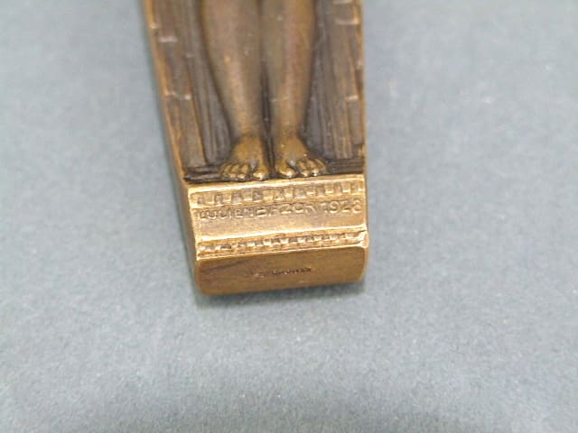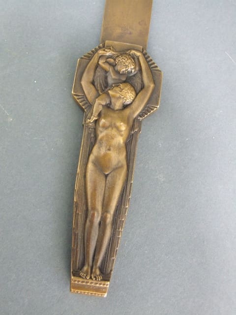 French Art Deco bronze letter opener of excellent quality and fine casting. Depicting a nude lady holding a child cherub. A signed piece by Lucien Bazor and dated 1928 and stamped bronze.