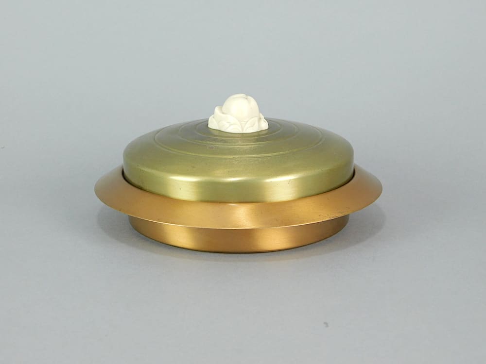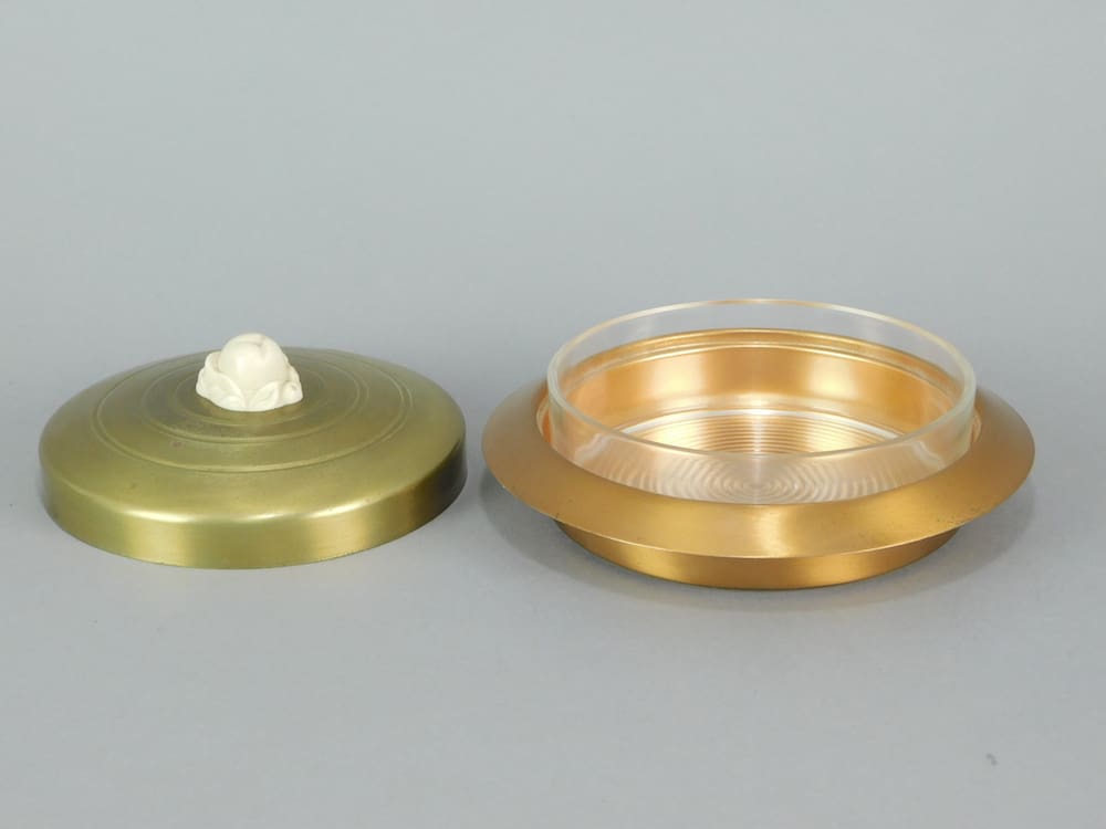A lidded dish, this one unsigned, but by Chase with a single glass bowl insert and copper and gilt finish with cream fruit shaped handle.