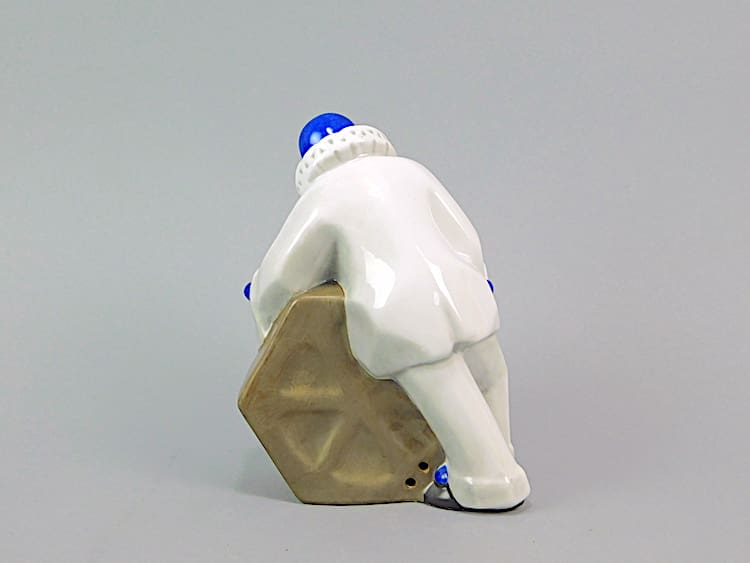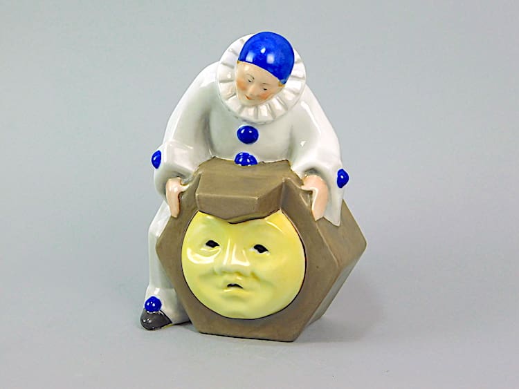A wonderful ceramic night light in the form of a Pierot and moon face. Marked to the base, Limoge, France, Lagrare and initialed. There are two holes to the reverse for the bulb holder and wire. I imagine it would have looked wonderful when lit as light would have been emitted from the eyes and mouth of the moon.