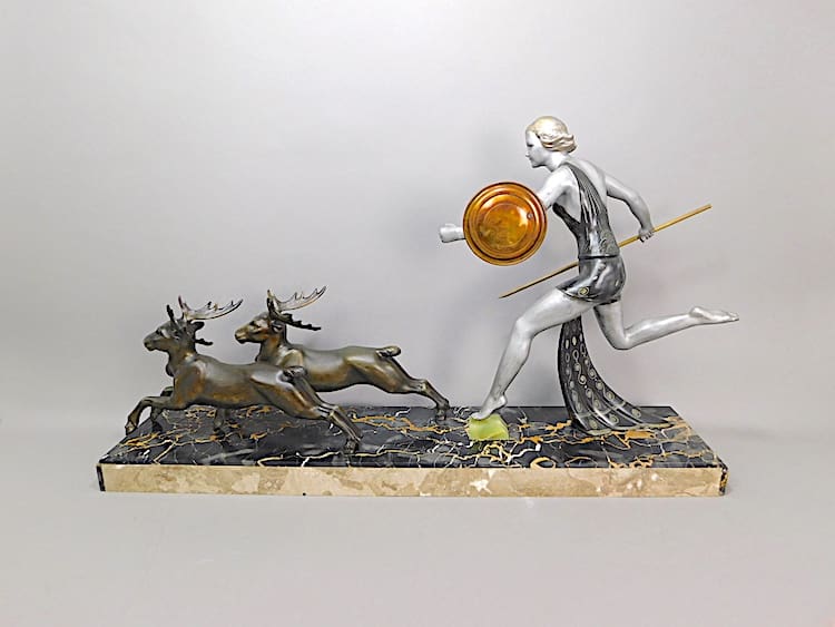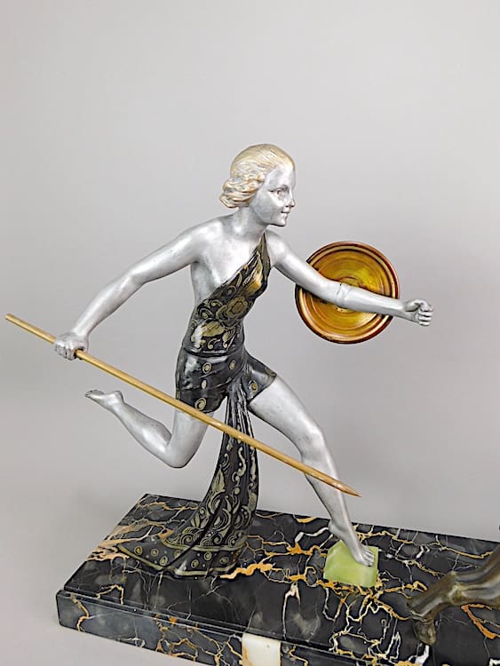 This large French spelter group is signed on the back of the lady’s sash, a very large base, which is of Portorro Extra.