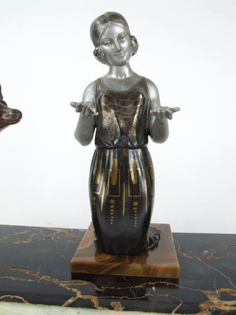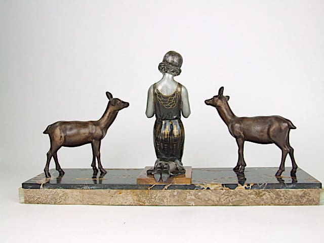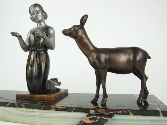 French spelter kneeling lady figure holding berries for a pair of deer. On a portorro marble base with green onyx intersections. An unsigned Limousin made by Poccard Freres (Poccard and Richoux) in Paris.