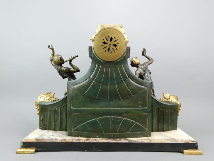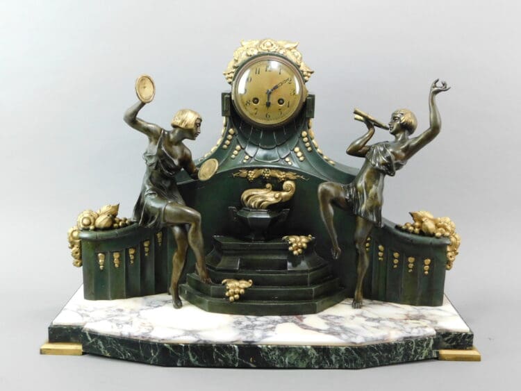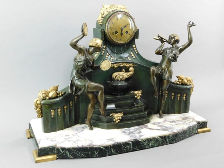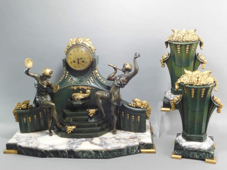 French Spelter clock, unsigned but by Limousin. The clock is mounted in a spelter wall with stylised column detail and flowers cascading everywhere. At the front is a stepped alter with a flaming urn, and around it dance the two ladies. The base is of pinky-mauve marble with verdigris front and sides. This detail is echoed on the 2 matching side pieces.