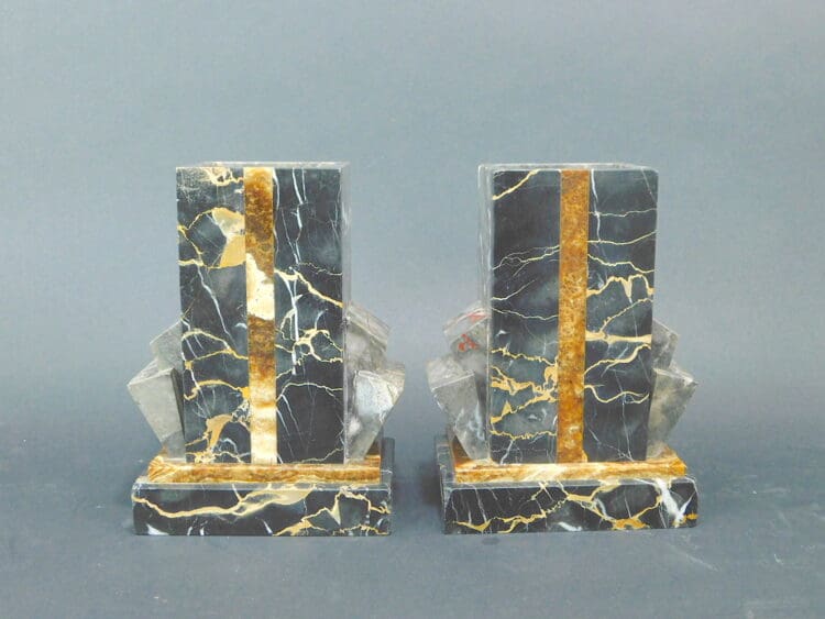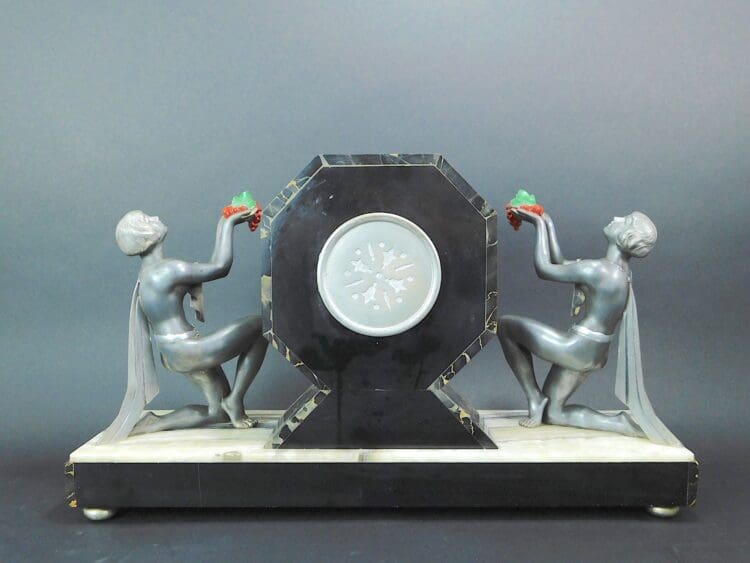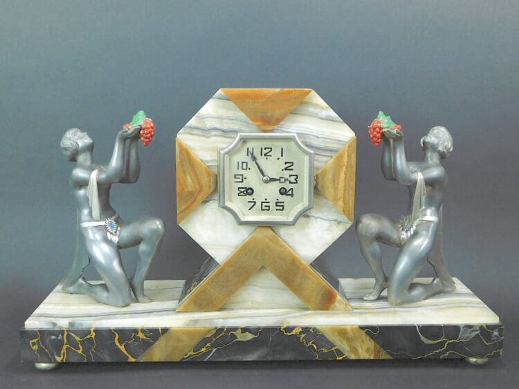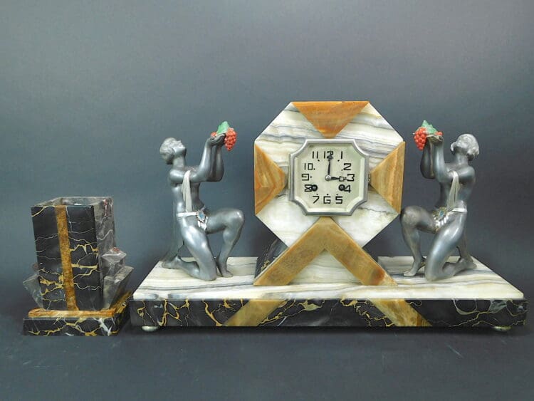 An unsigned French clock-set with two spelter ladies with 2 matching side pieces. The ladies are naked except for scarves draped over and Egyptian style belts, and they are holding bunches of grapes with some enamelled detail still showing.