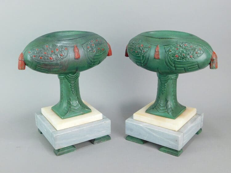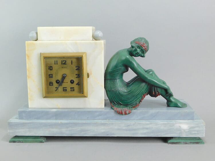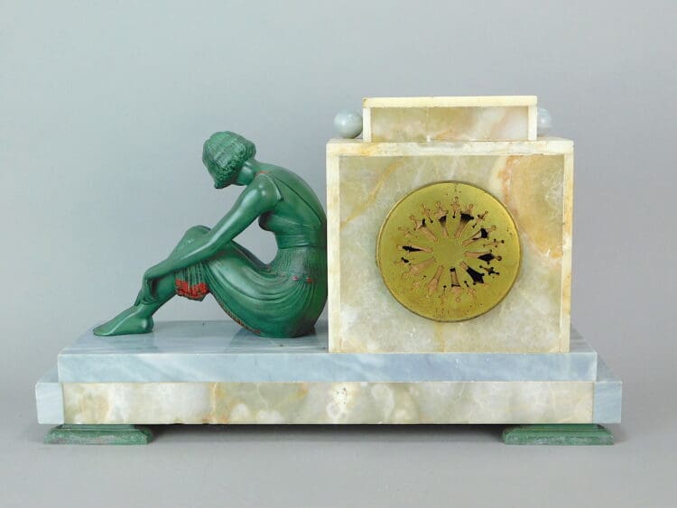 French grey marble and spelter clock set with green patinated spelter lady sitting at the side with 2 spelter side pieces. Unsigned but by Limousin.