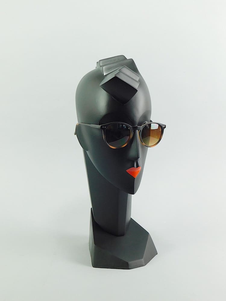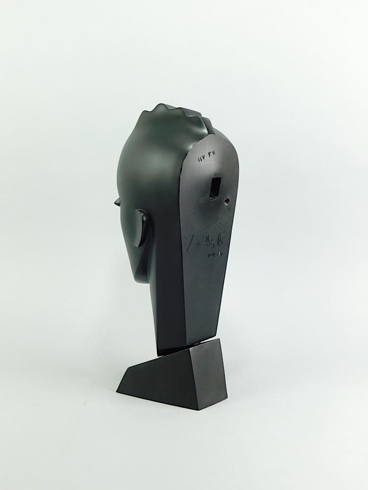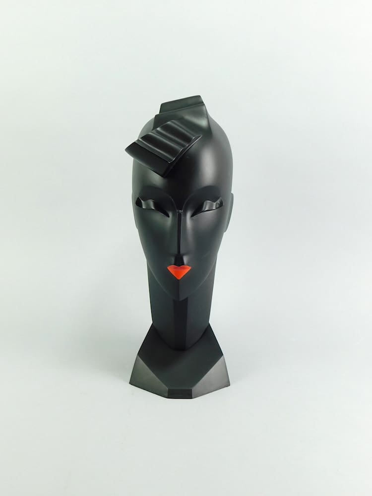 Black art deco neoplastic bust – her title is Waves. Signed and dated 1987 to the reverse.