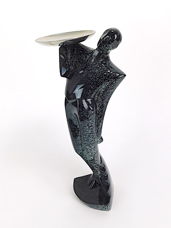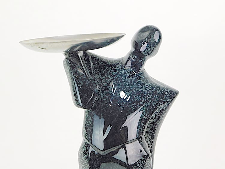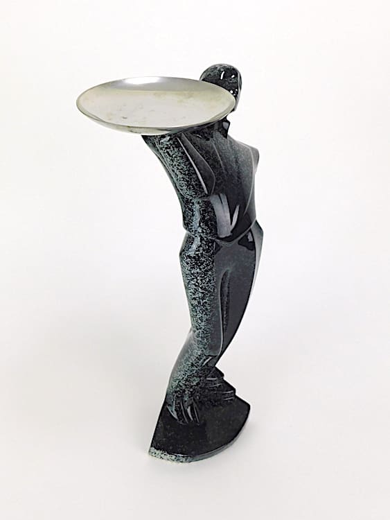 This one has come from some old stock that came out of her workshop when she finished the business in the mid 1980s. This one has the stepped curved base which makes it a very early one and possibly a prototype. It has a speckled black/green finish. The tray is chromed metal.