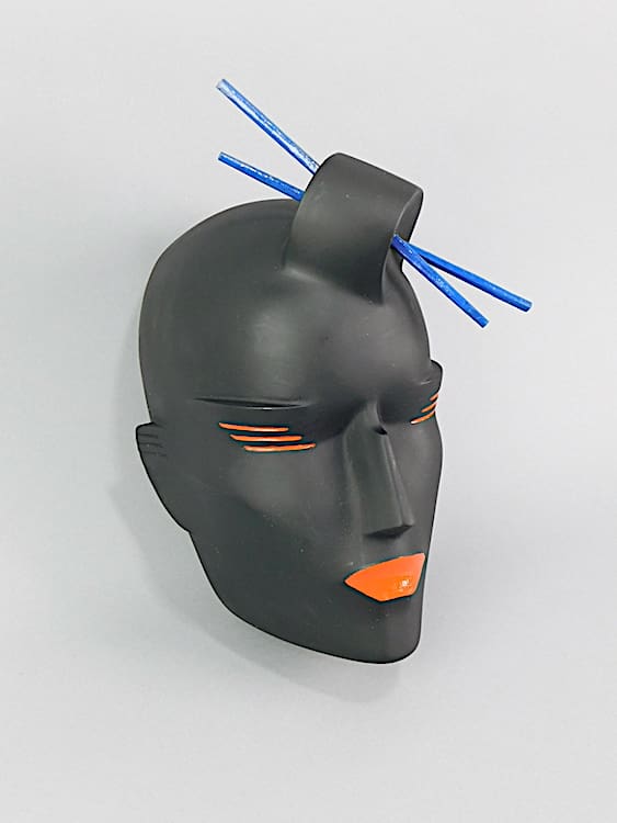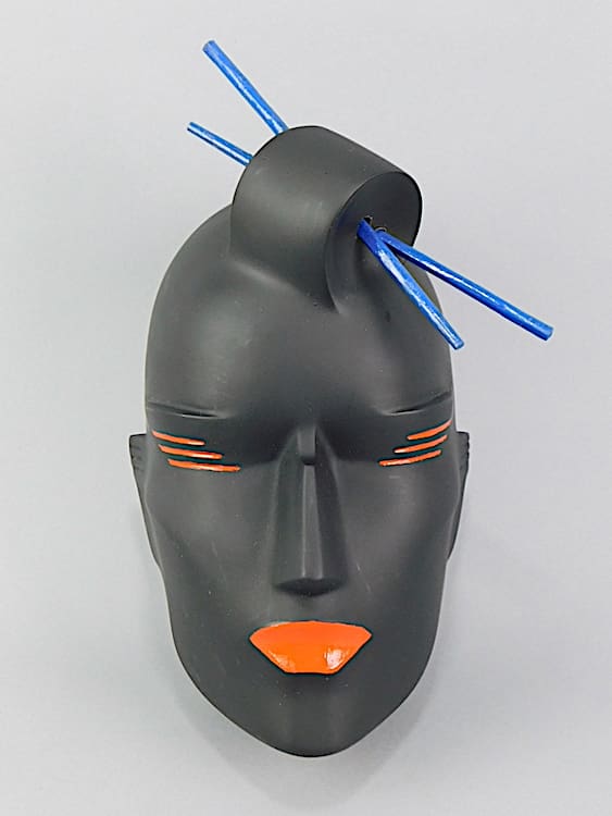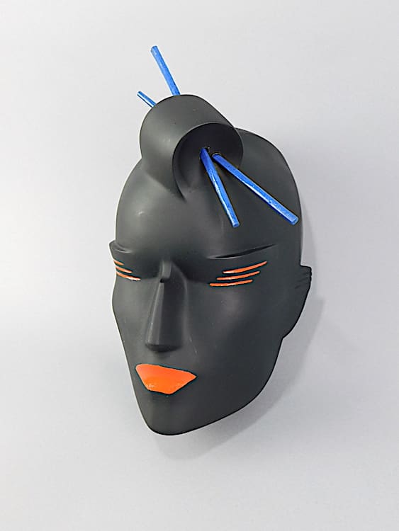 Art deco black neoplastic oriental lady wall mask with chop sticks in her hair. Originally would have been supplied with a metal coat hanger type stand (not supplied). Can also be hung on the wall. Signed to the back and dated 1987 made just before she closed up the business. Purchased directly from Lindsey B. This is part of a collection of old stock and original unique prototypes from her workshop.