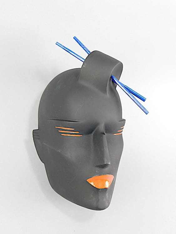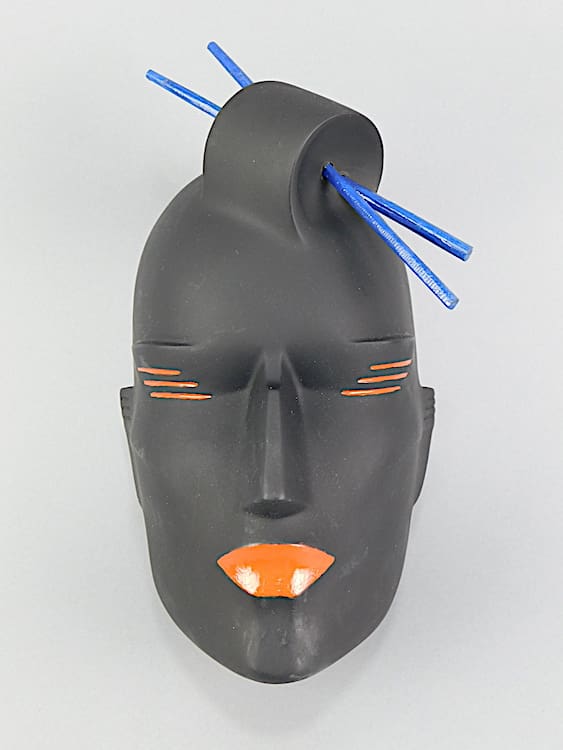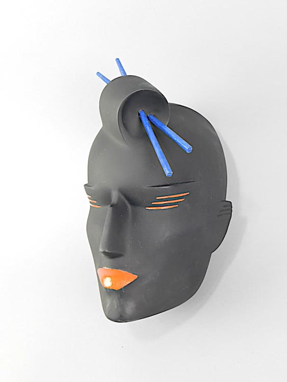 Art deco black neoplastic oriental lady wall mask with chop sticks in her hair. Originally would have been supplied with a metal coat hanger type stand (not supplied). Can also be hung on the wall. Signed to the back and dated 1987 made just before she closed up the business. Purchased directly from Lindsey B. This is part of a collection of old stock and original unique prototypes from her workshop.