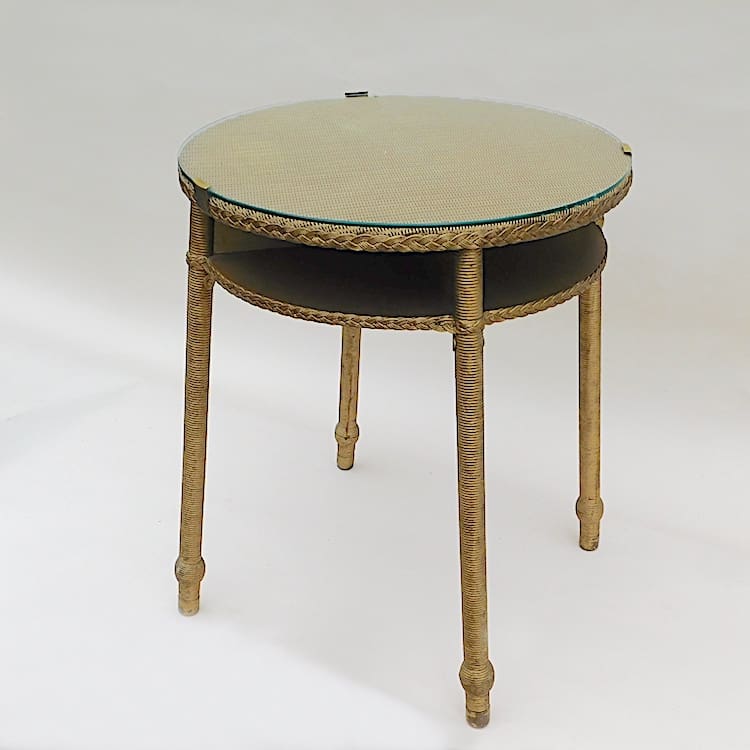 Original vintage Lloyd Loom table (I have 2). Lloyd Loom was invented by an American, Marshall Burns Lloyd, in 1917. The tables make a nice pair but are available separately. I also haver a chair (FN1490). It has an original glass top and corner pockets to each side.