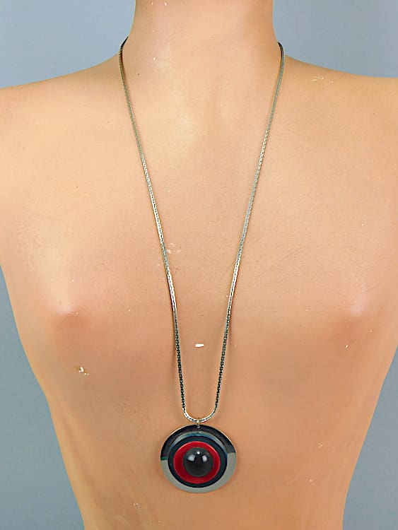 Vintage German galalith discs in black and red galalith mounted on a chrome disc backing plate.