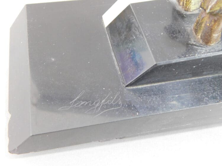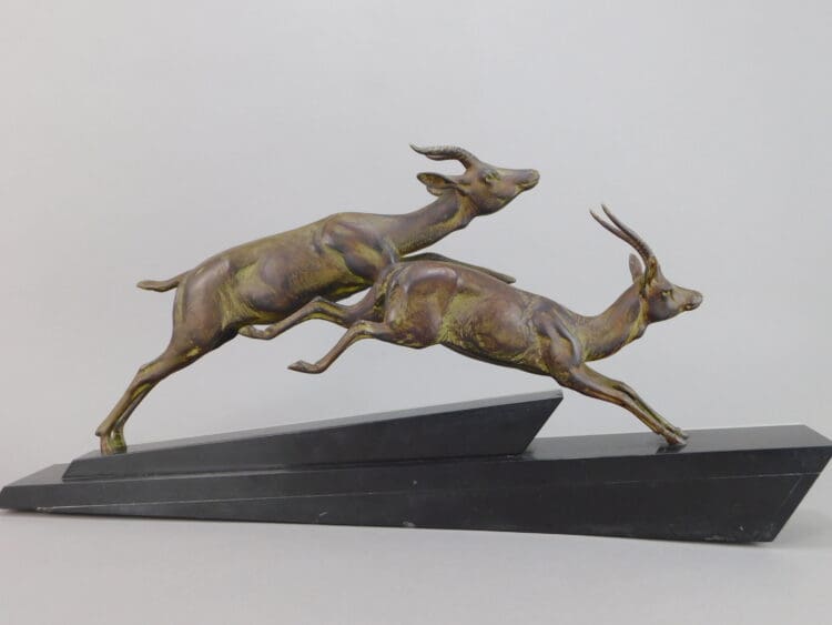 French Art Deco bronze patinated spelter leaping deer statue. Onyx and black marble wedge shaped base – signed to the right hand end Longfils.