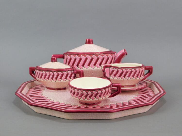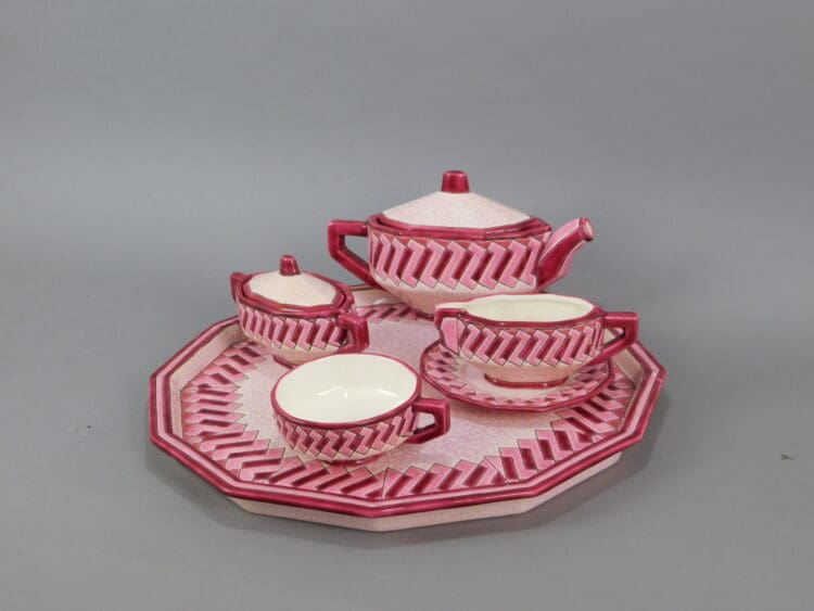 Large faience pottery bachelors tea set with modernist angular shape, consisting of teapot, tray, milk jug, sugar bowl, 1 teacup and saucer. Typical Longwy crackle glaze ground with raised geometric patterning in pink and cerise. Factory printed marks to the underside.