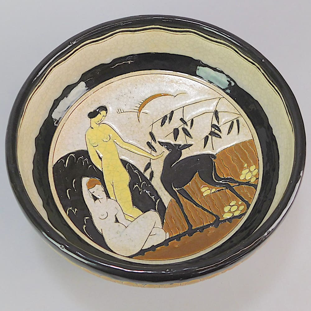 Large circular dish in polychrome earthenware hand painted in thick enamel depicting a pair of stylised nude ladies and a deer.