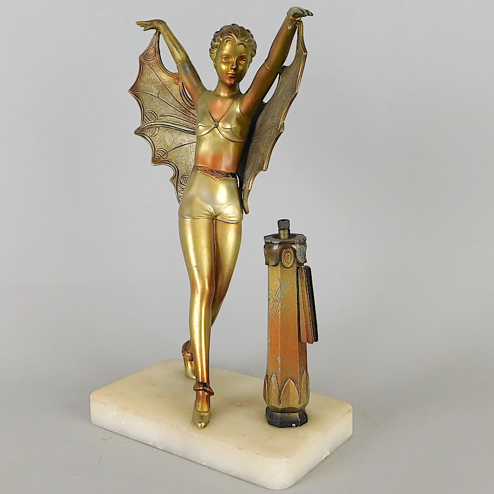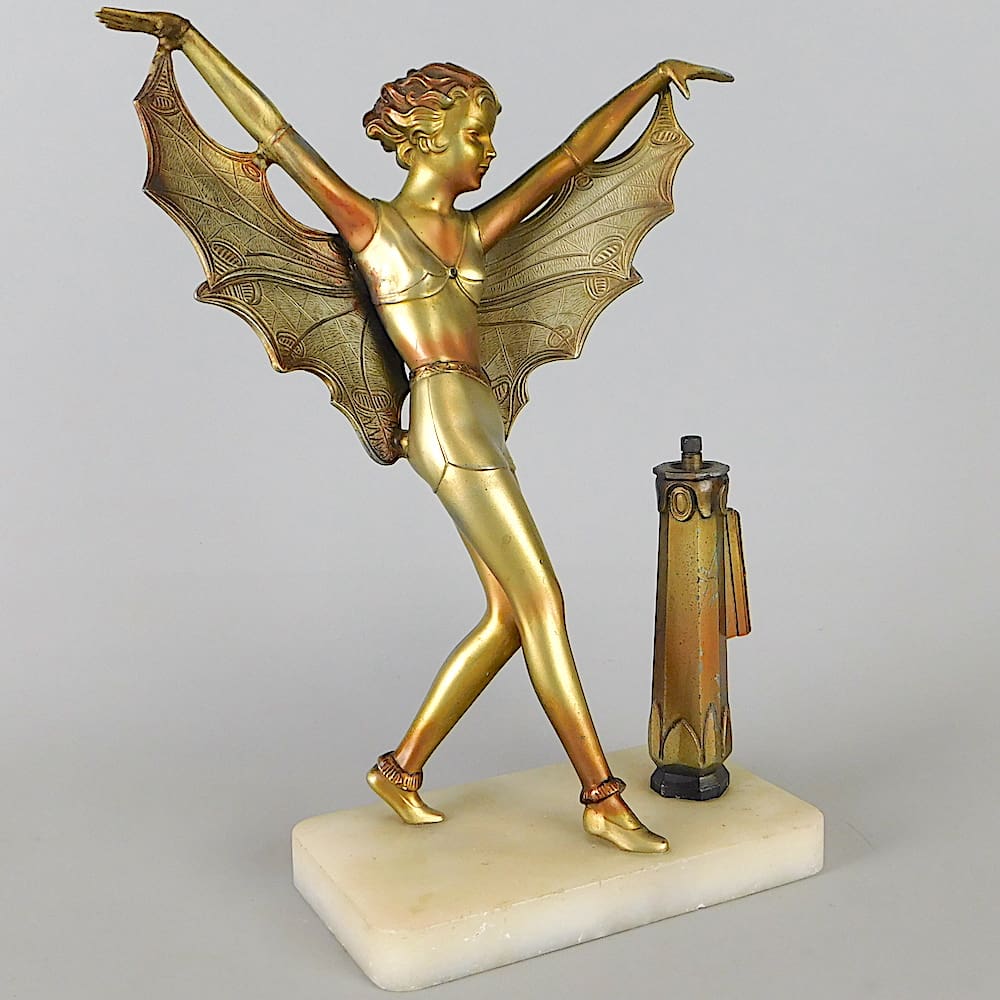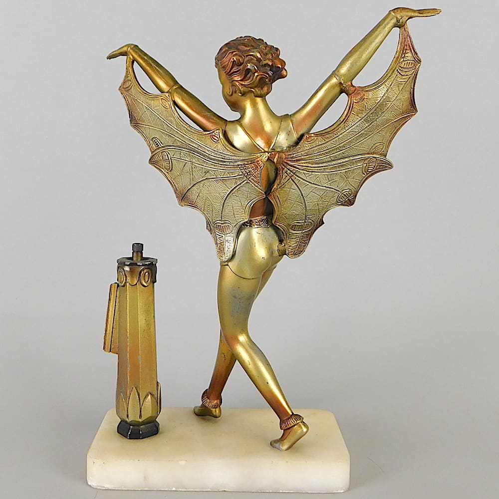 Austrian spelter art deco dancer with a winged costume standing next to a striker column (cigarette lighter) mounted on a portorro marble base.