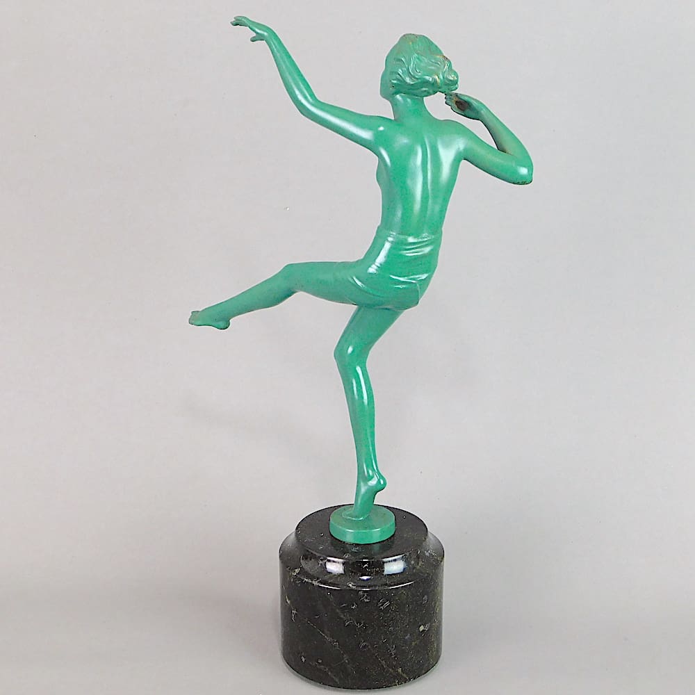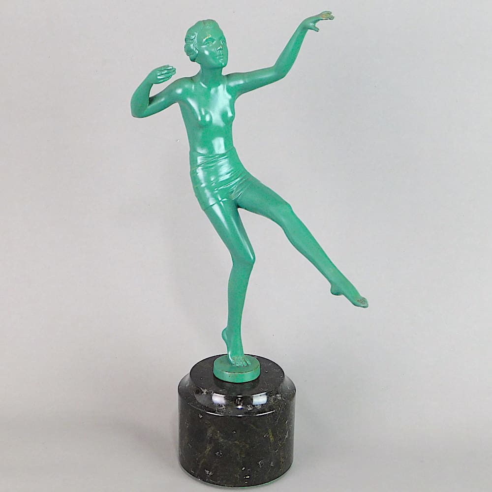Stylish green patinated spelter dancer, unsigned but by Lorenzl and mounted on a black marble base.