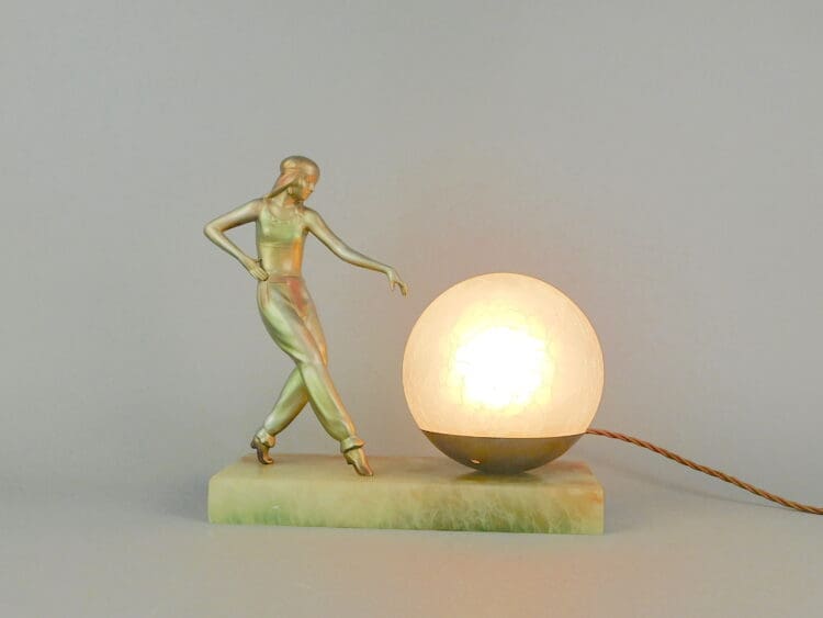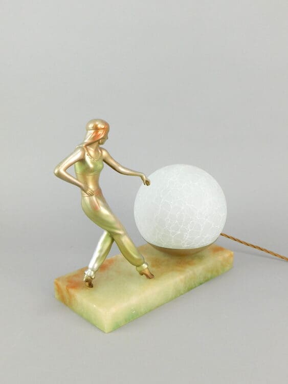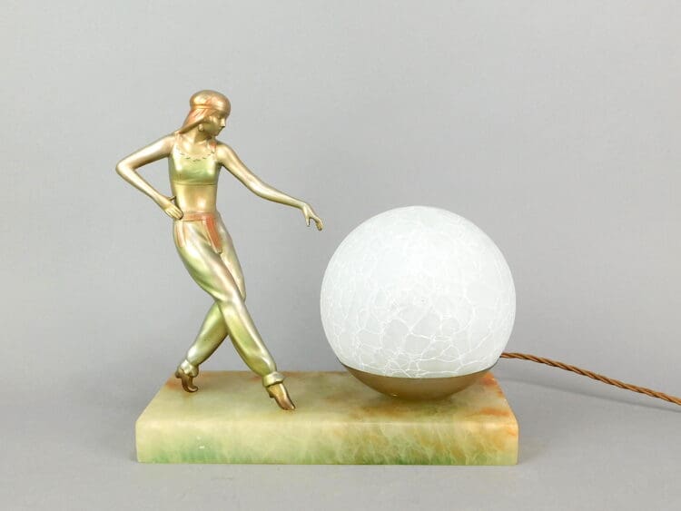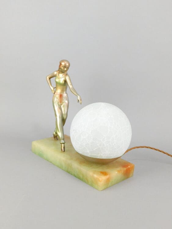 Lovely Austrian stylised spelter lady wearing harem costume and dancing next to a marbled glass globe shade. The base is of green alabaster. Unsigned but definitely by Lorenzl. Rewired.