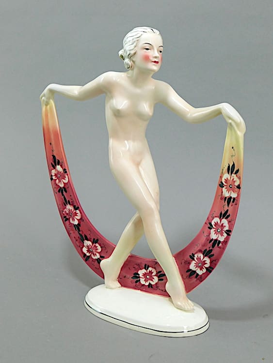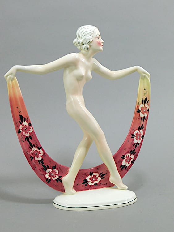 Wonderful German ceramic dancer, made by Katzutte in the 1930’s and I believe designed by Lorenzl or possibly Dakon. Under the base bears the Katzutte mark.