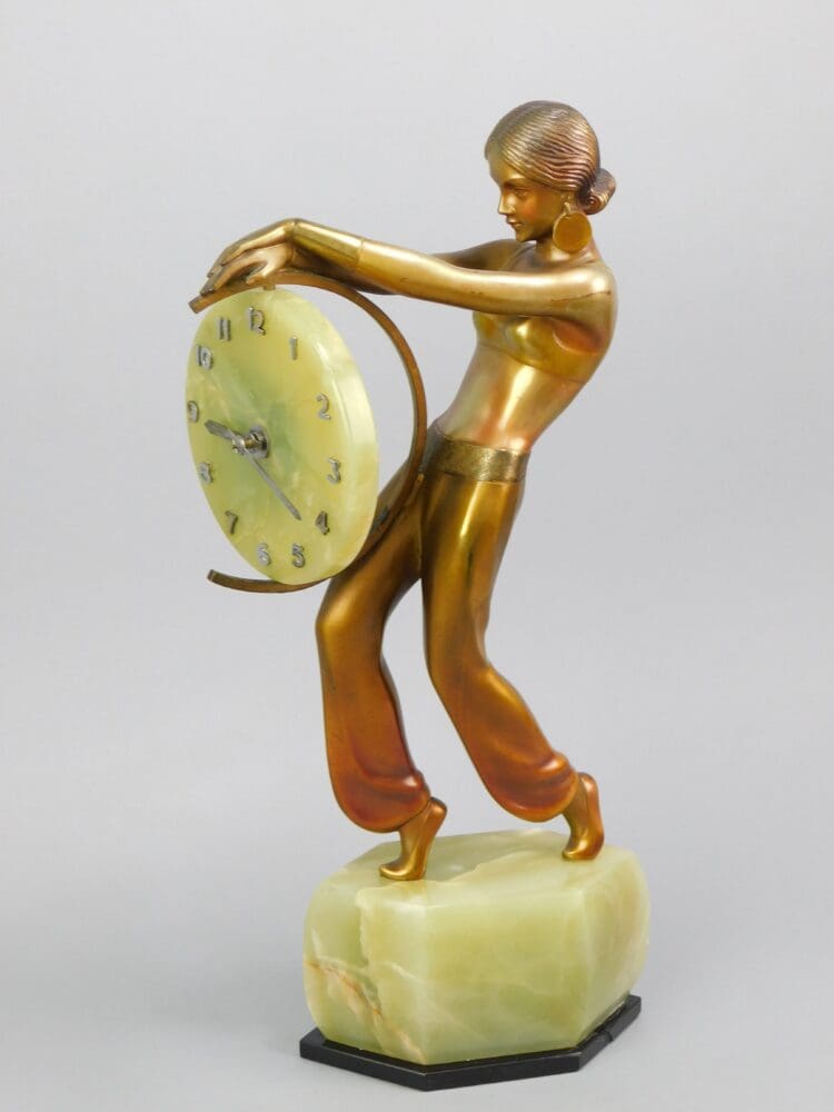 An unsigned Lorenzl bronze harem lady holding a clock. Clock pivots on a central bar.