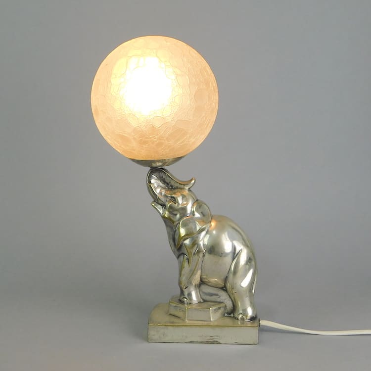French silvered bronze stylised art deco elephant table lamp, signed to the bronze base Fontinelle.