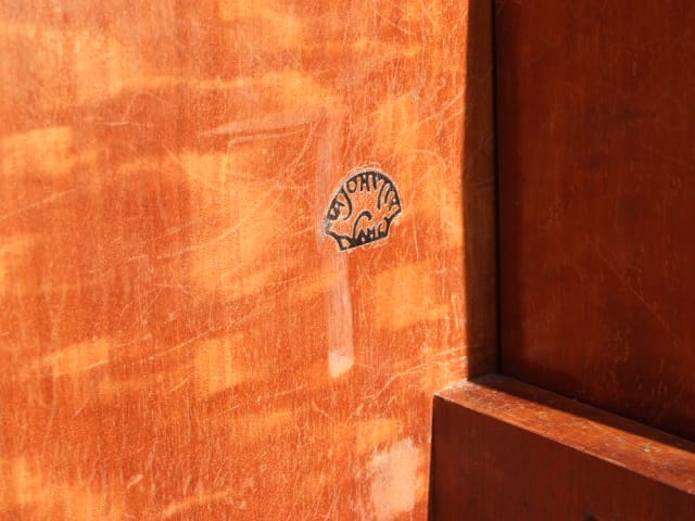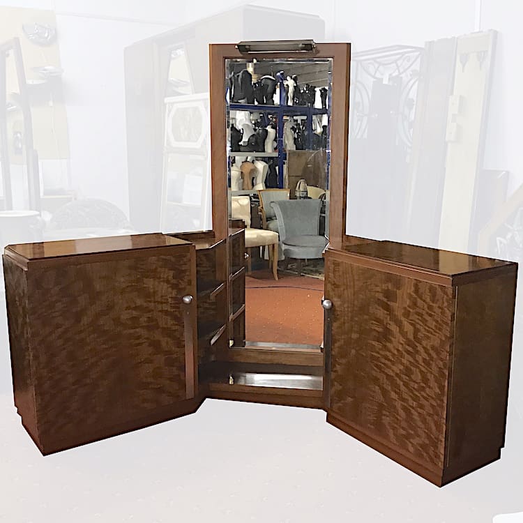 There is a cupboard section to either end with hidden shelves on either side of the central cheval mirror. Above this an original nickel plated light fitting.