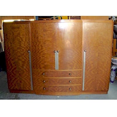 Large scale French art deco bedroom suite made of a rare quartered mottle figured makore (African Cherry) and made by the famous cabinet company – Louis Majorelle of Nancy, France. Each piece is signed Majorelle in the usual inlaid signature.