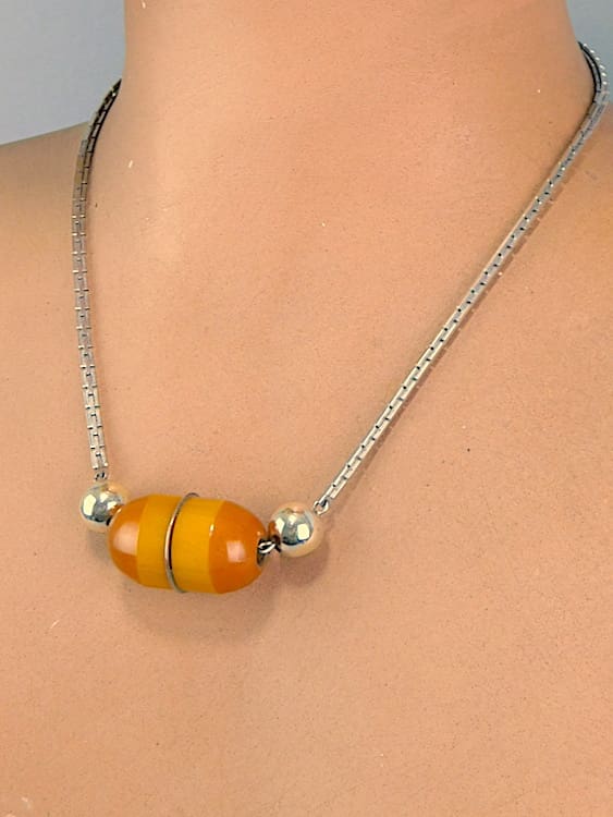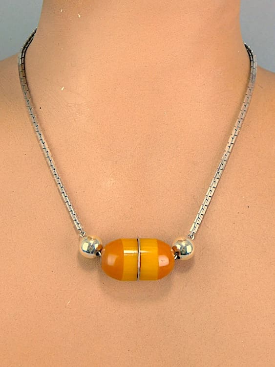 Intricate chain and amber and butterscotch lozenge necklace. Made by Bengel in the early 1930’s.
