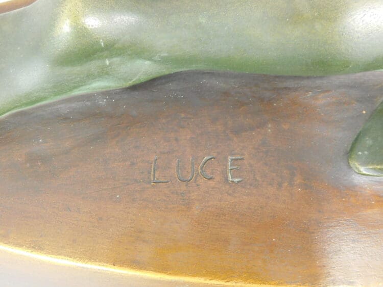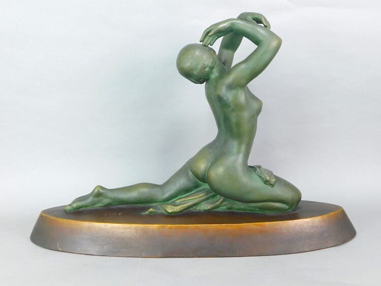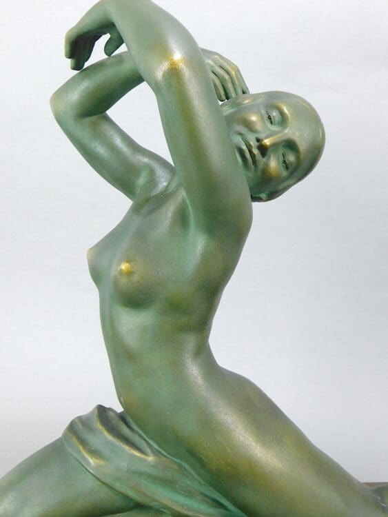 Beautiful and stylish French nude dancer. Both the figure and the base are of one piece terracotta, and the lady has a dark green-bronze patina and the base is brown. Signed in the base.