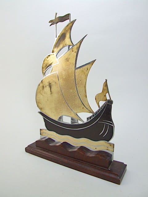 French art deco sailing ship – a flat two-dimensional metal panel with dinanderie detailing.