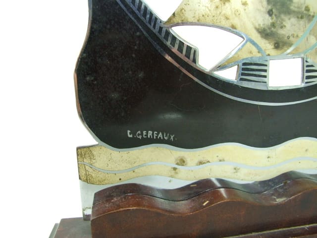 Signed Gerfaux (Lucien Gerfaux) to the hull. Mounted in a wooden wave effect base.