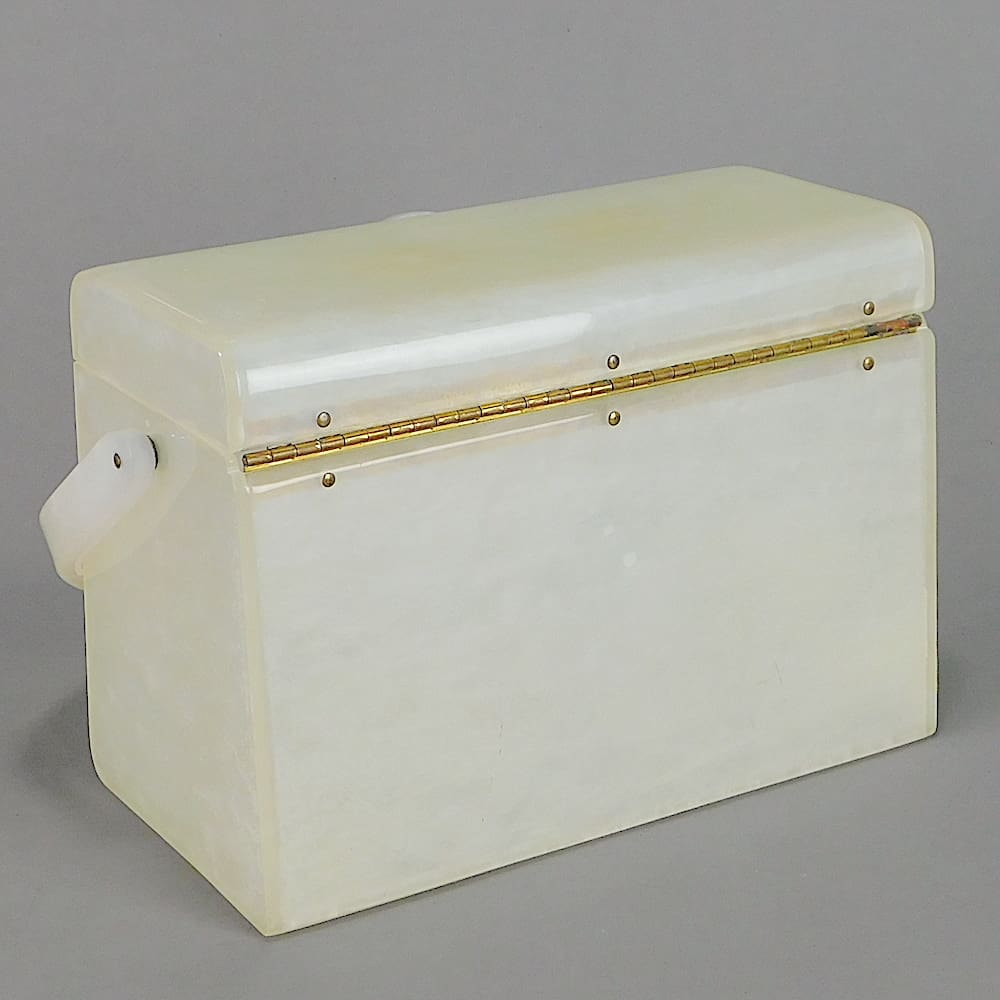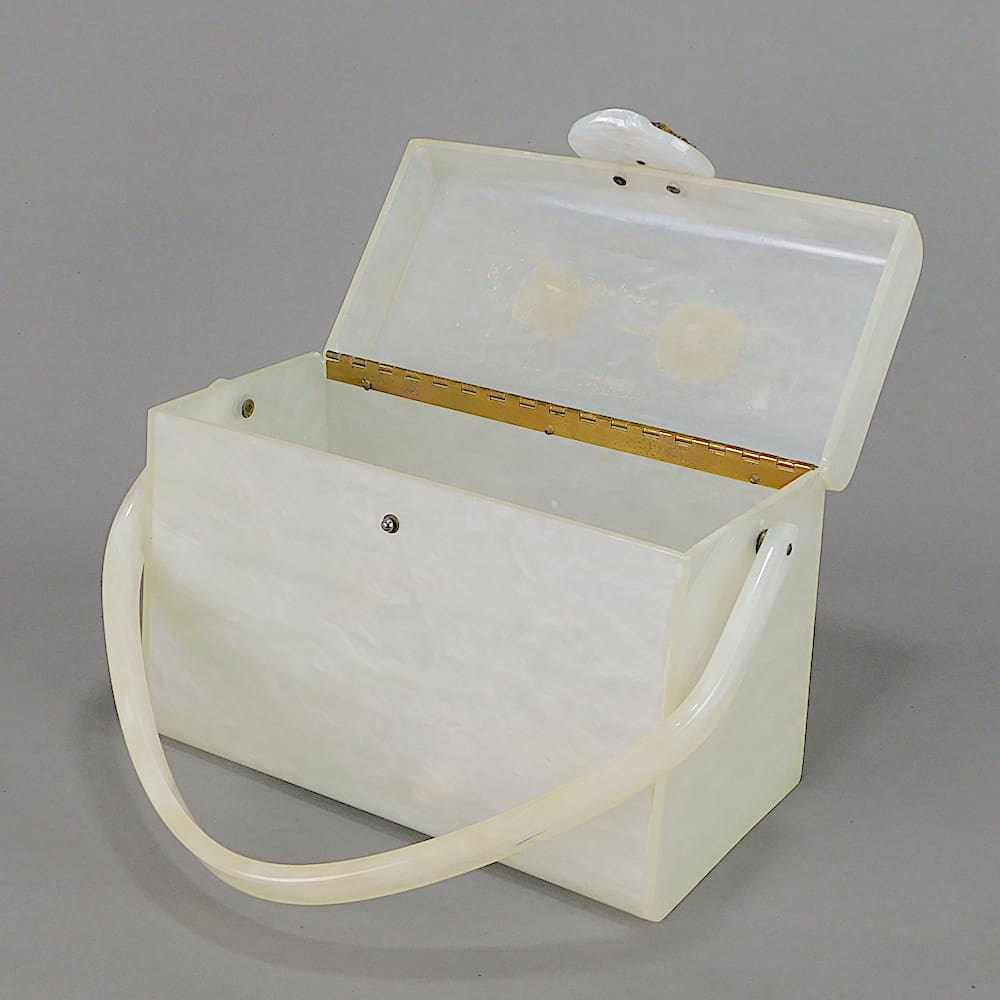 A large American 1950’s marbleised lucite box bag by Wilardy. With filigree and pearl clasp. Inside is empty although there may have been a mirror to the inside lid originally – as there are signs of old glue to hold it.