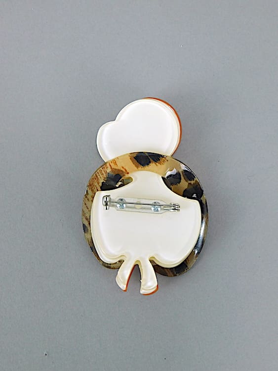 French phenolic lucite flapper brooch. Fitted with a roll safety clasp.