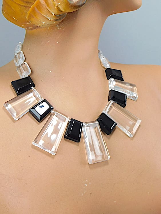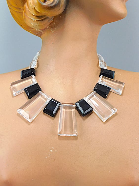 This black phenolic and clear lucite fringe necklace probably dates to the 1970’s.