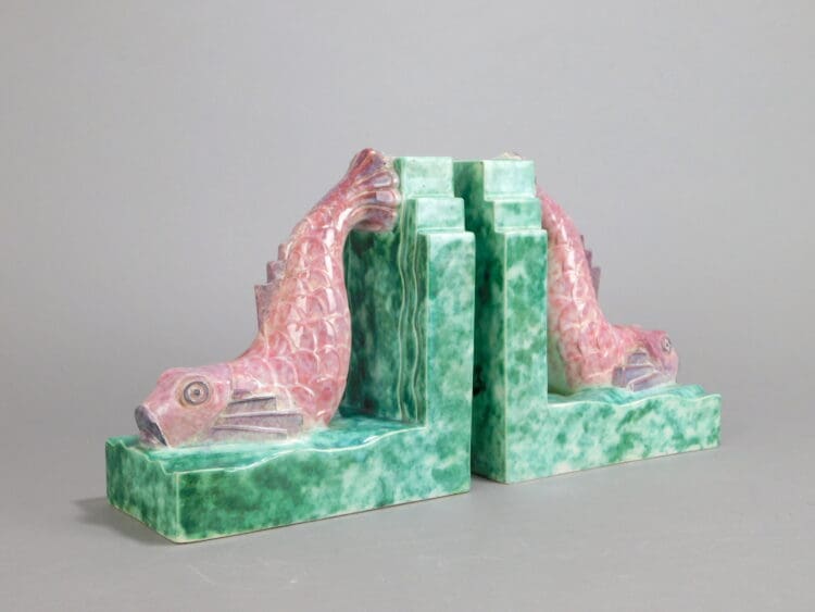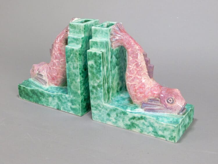 French fish bookends with vase back sections, signed Lusca, France under the base.