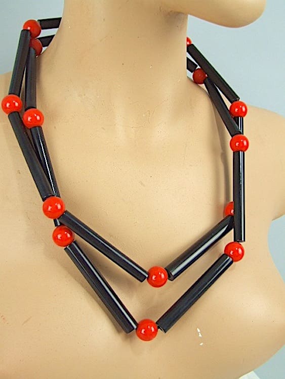Red and black Galalith necklace made by Bengel in the early 1930’s. Long flapper length that can be hung as a single strand or doubled up to make a very unusual necklace. Strung on elastic to allow it go over the head twice.