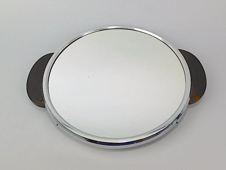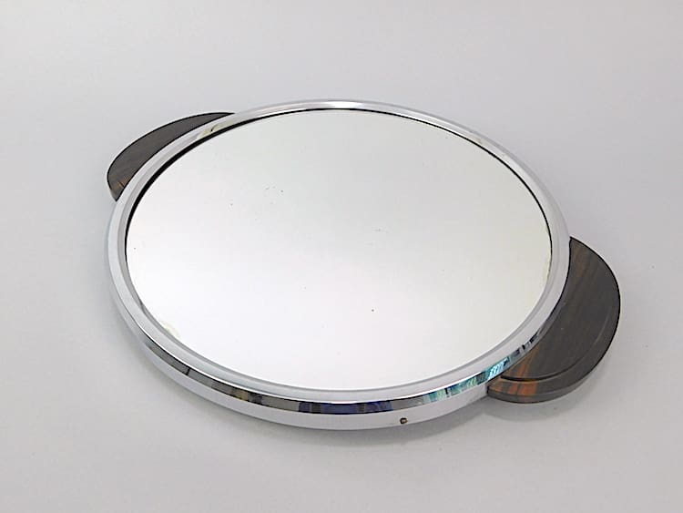 French circular tray with macassar handles on chromed frame and central mirror glass.