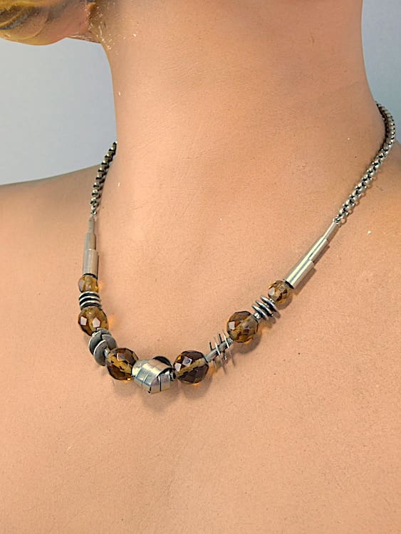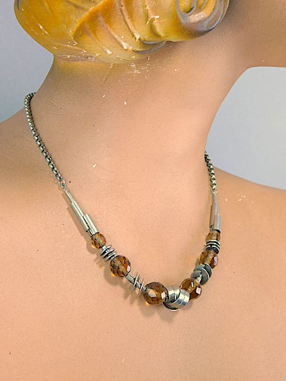 Peach faceted glass and curled chrome necklace made in the early 1930’s by Jakob Bengel.