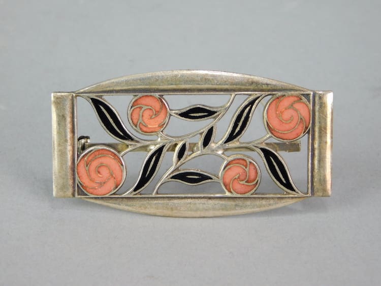 French metal brooch with pink and black enamel detailing of Mackintosh style roses and foliage. Possibly by Pierre Bex of Paris.