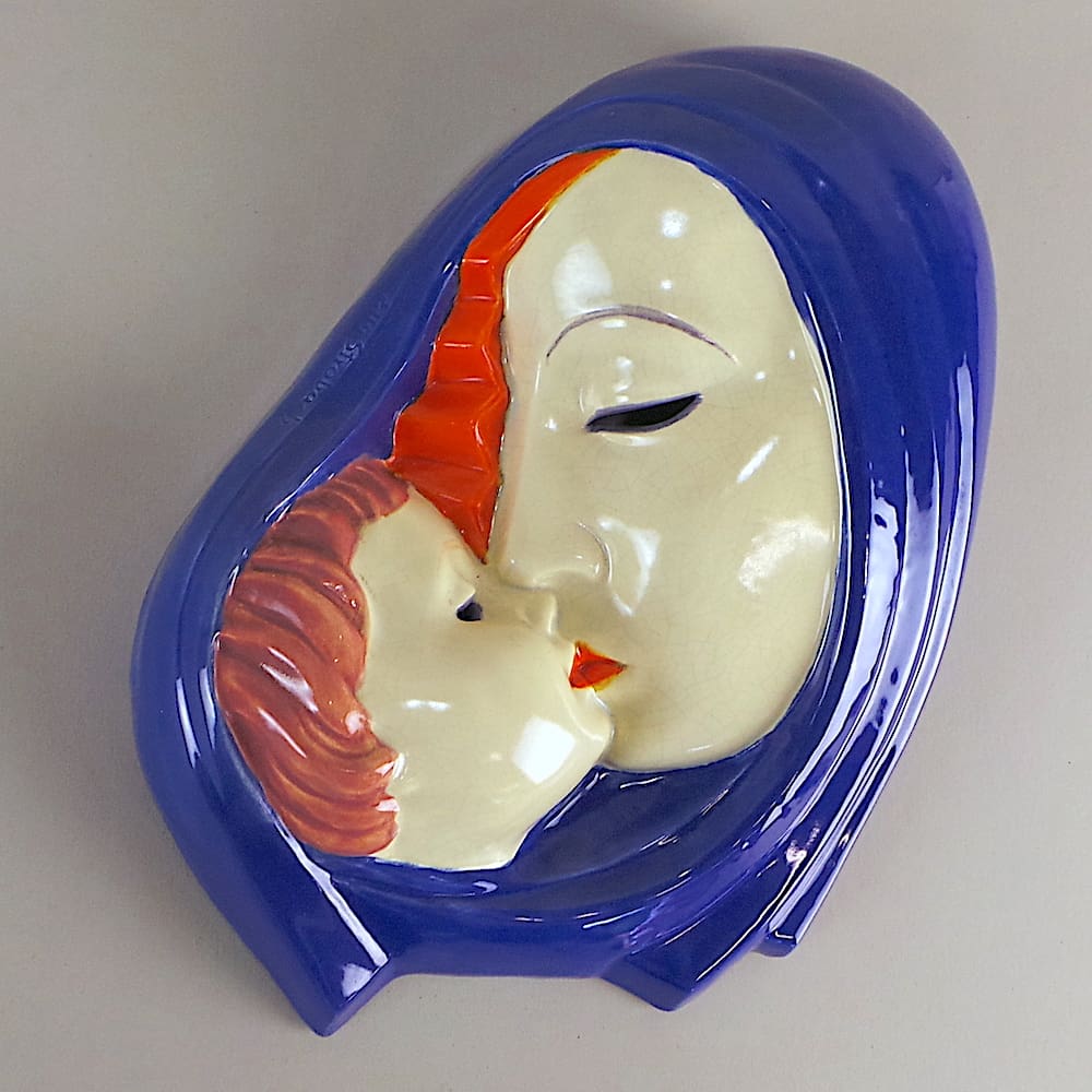 Rare Czech Royal Dux hand painted art deco ceramic wall mask of mother and child.