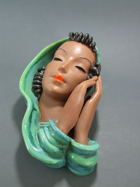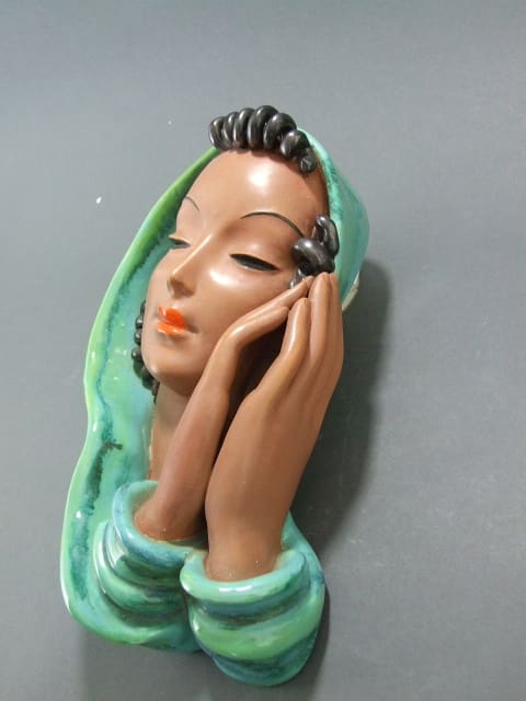 Large terracotta hand painted art deco wall mask by Goldscheider. Designed by Adolf Prischl in 1934 and called Madonna. This mask was made in various sizes and finishes and this is the largest. Model number 7579 and Goldscheider Wien stamp are marked to the back.