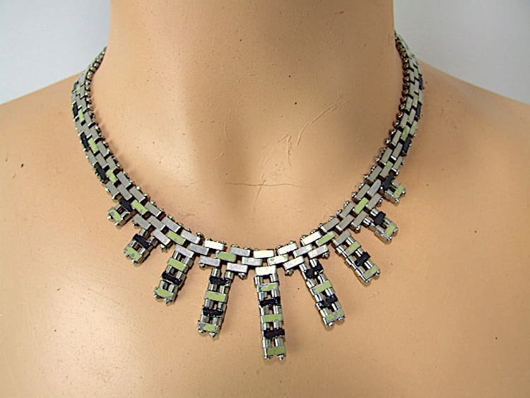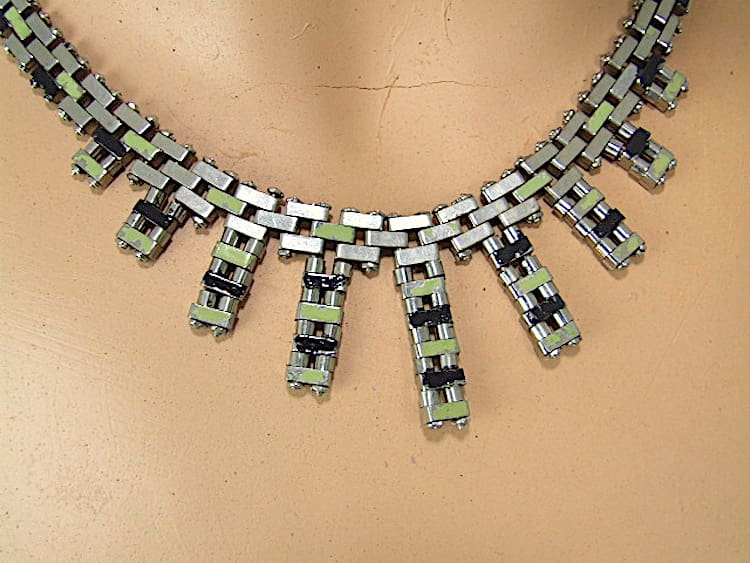 Early 1930s art deco maerwerk necklace by the Jakob Bengel company – Germany. This is a vintage and used art deco necklace with multi link chromed panels with green and black enamel detail.
