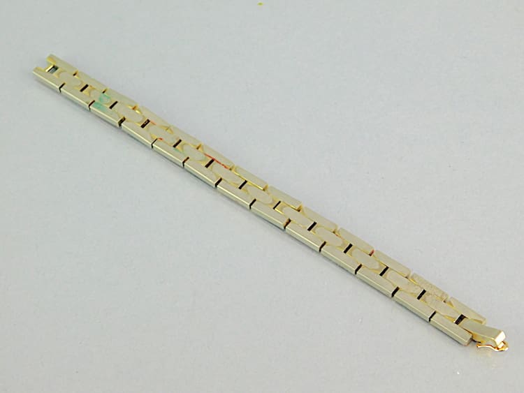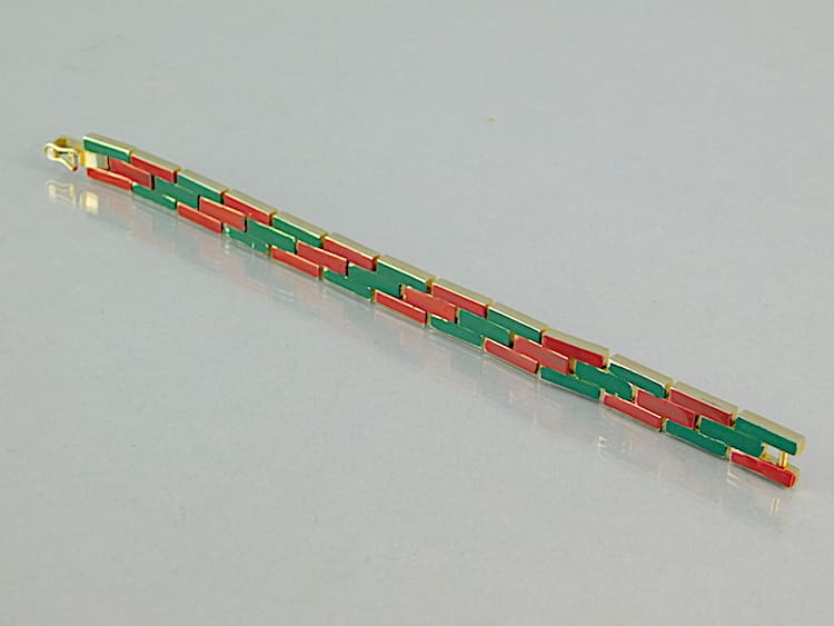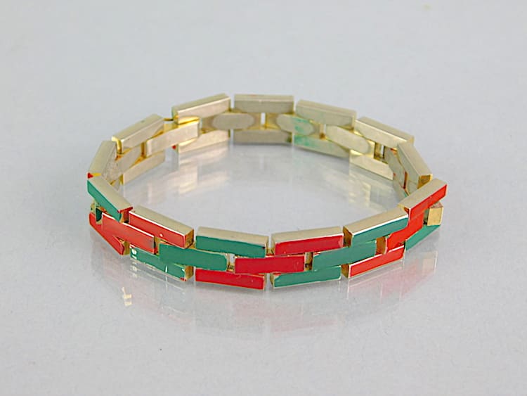 Early 1930s brickwork bracelet with green and red enamel panels and is fitted with a safety loop.