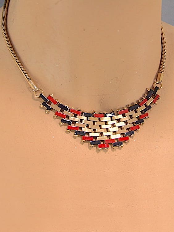 Unusual copper Maerwerk necklace with red and black enamel patterning. Made by Jakob Bengel in the early 1930s.