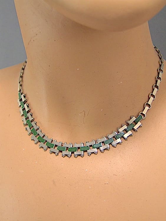 Green enamel maerwerk necklace. Made by Jakob Bengel in the early 1930s.