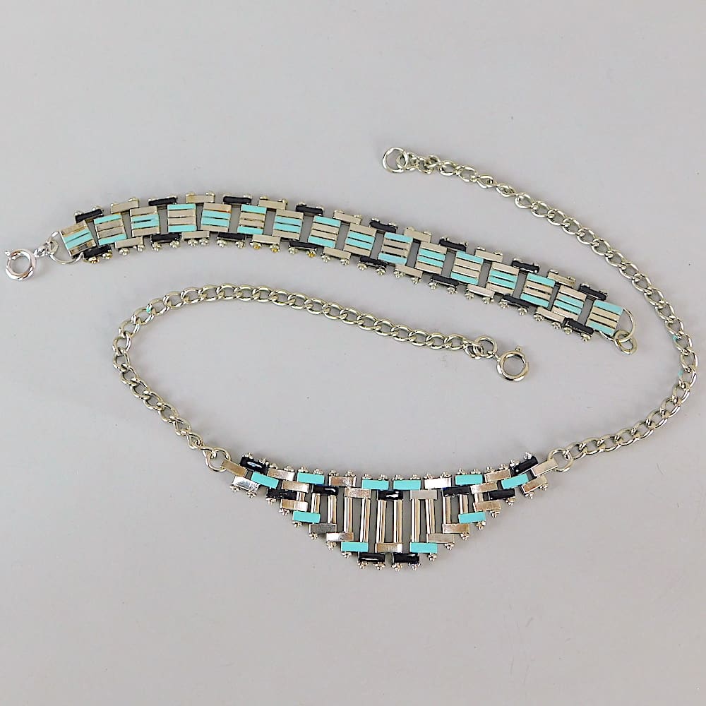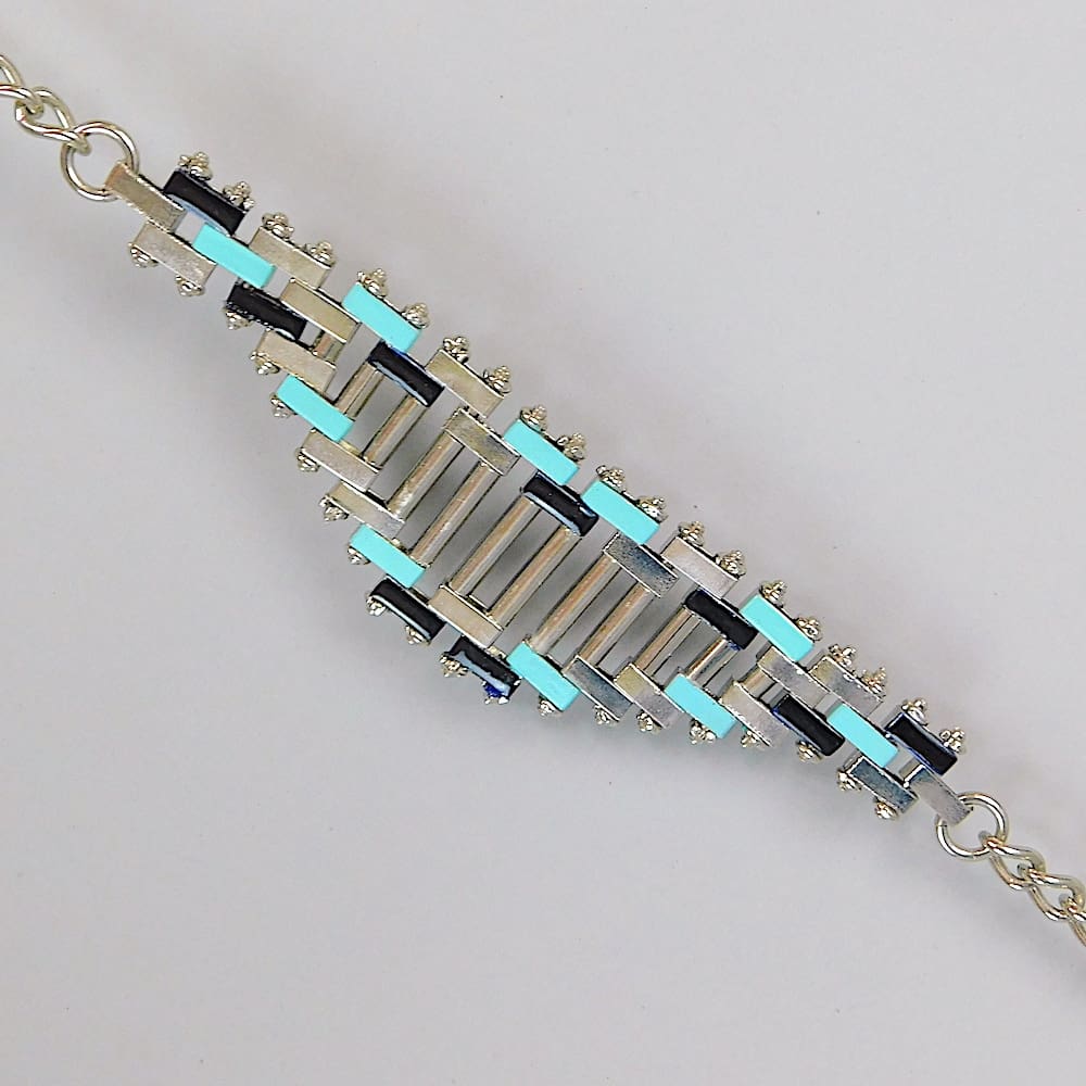 The necklace measures 16 inches (41cm) from clasp to clasp and 1.25 inches (3cm) high to the central panel.