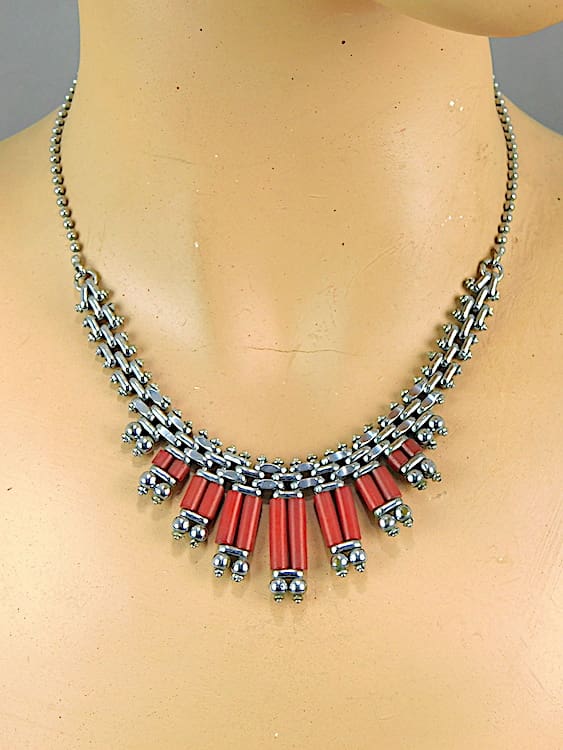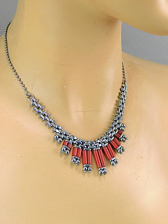 1930’s German part merwerk and red galalith necklace from the house of Jakob Bengel.