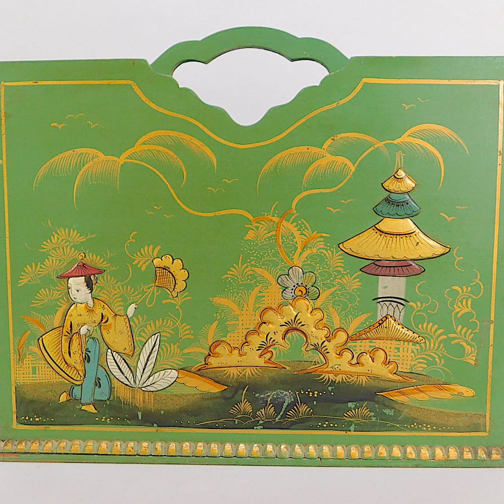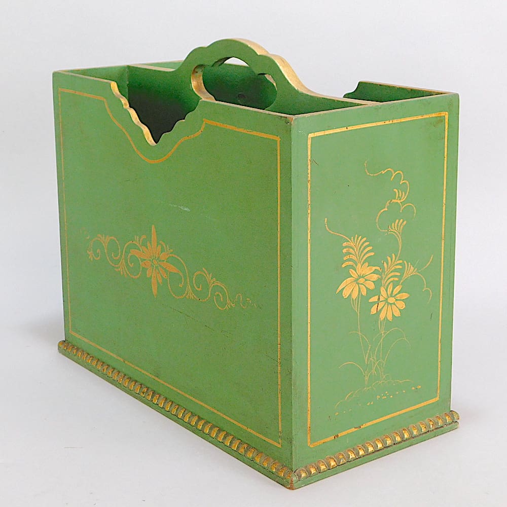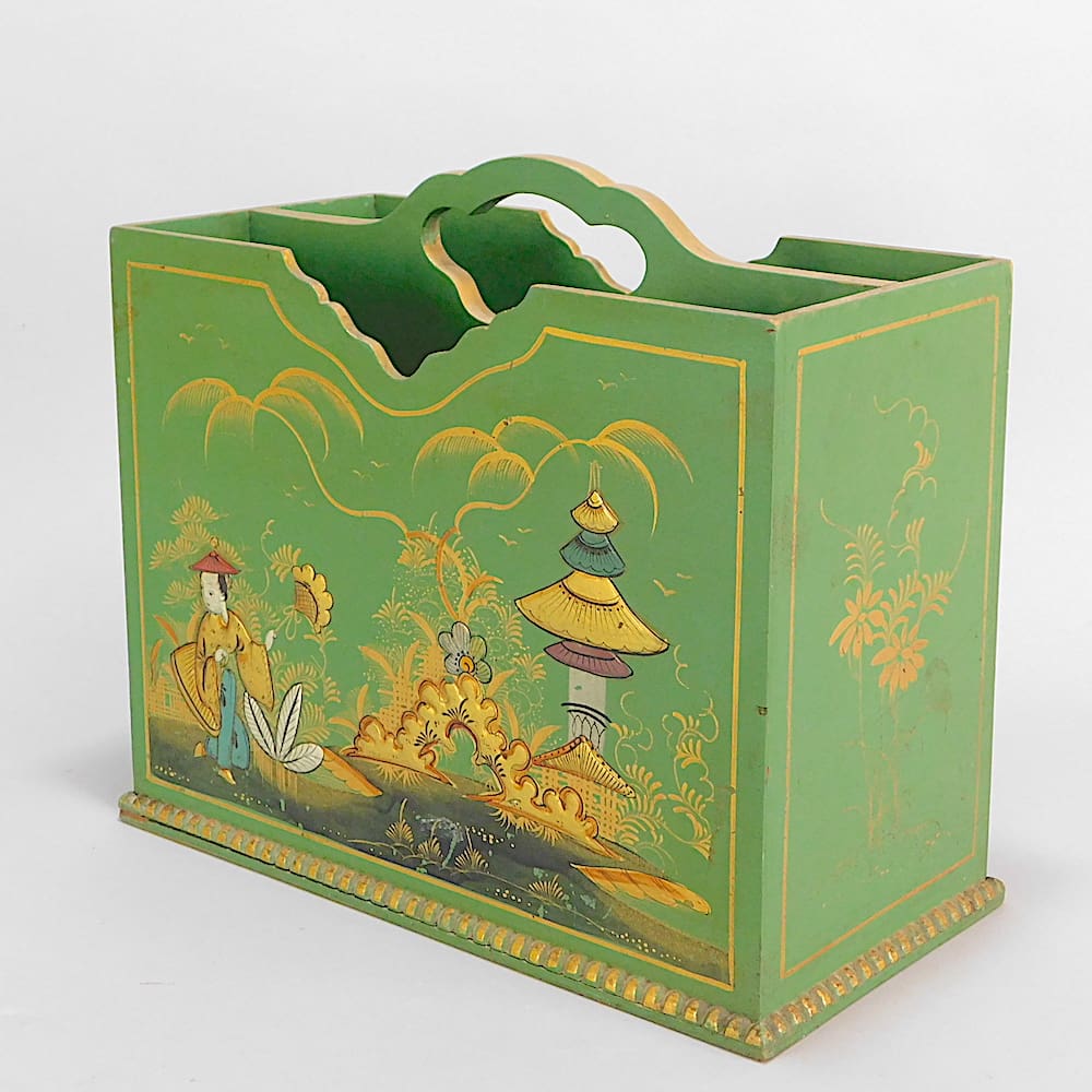 Hand painted 1930s English Chinoiserie wooden magazine holder depicting an oriental scene to the front and floral patterning to the other 3 sides.